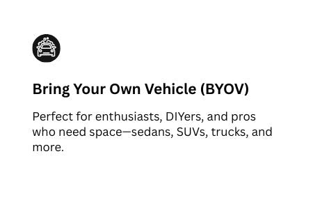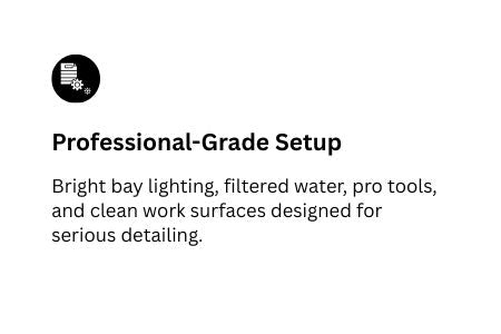A clean, climate‑controlled bay with pro lighting, spot-free water, and access to our retail store. Bring your tools or purchase/upgrade on site.