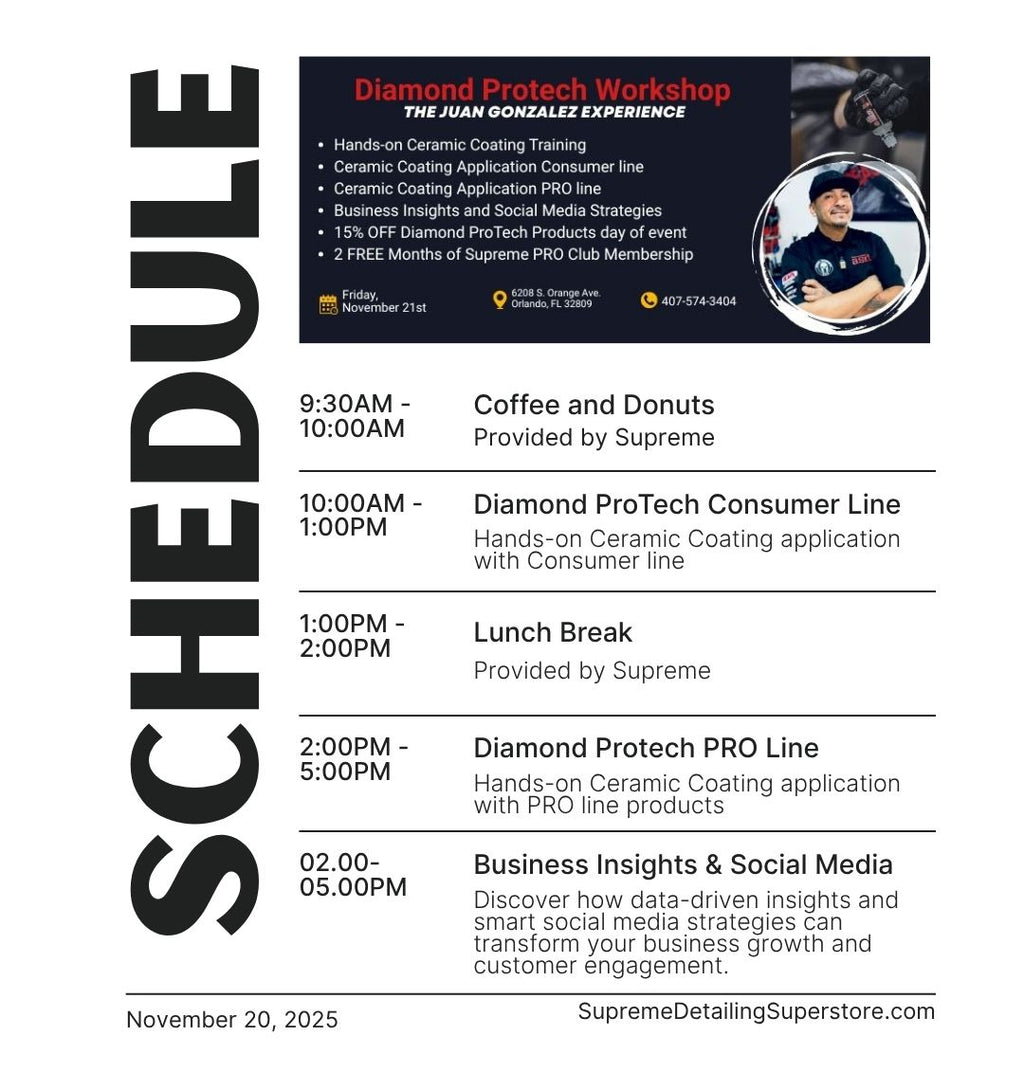 Únete a nuestro taller Diamond ProTech con Juan Gonzalez para una experiencia práctica de un día completo diseñada para llevar tus habilidades y tu negocio al siguiente nivel. Aprende el arte de la protección cerámica, domina las redes sociales y conecta con profesionales que comparten tu pasión por la excelencia.